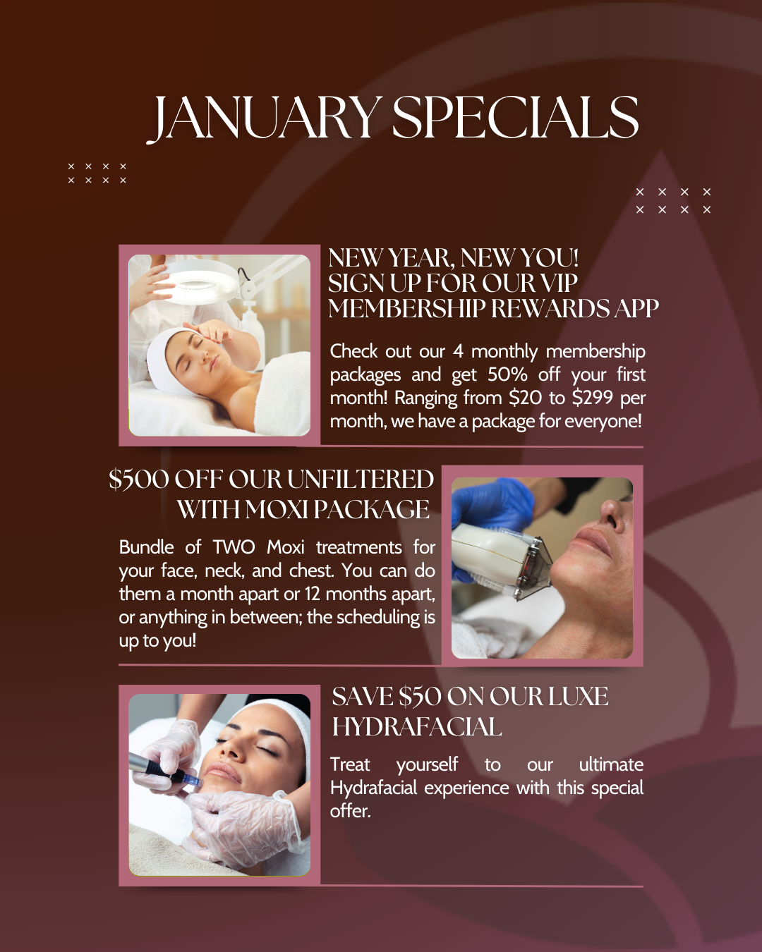 ✨ New Year, New you! Sign up for our VIP Membership Rewards App (deserteyesthetics.repeatmd.com) and check out our 4 monthly membership packages and get 50% off your first month! Ranging from $20 to $299 per month, we have a package for everyone – all packages lock in your toxin rate at $12/unit and give you great savings on all fillers and skin care products. Whether you want to lock in a great rate on a monthly facial, HydraFacial, or Forever Young photo facial, we have the package for you!